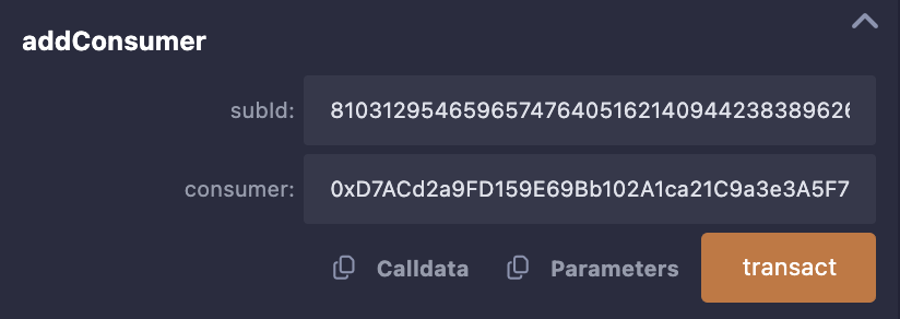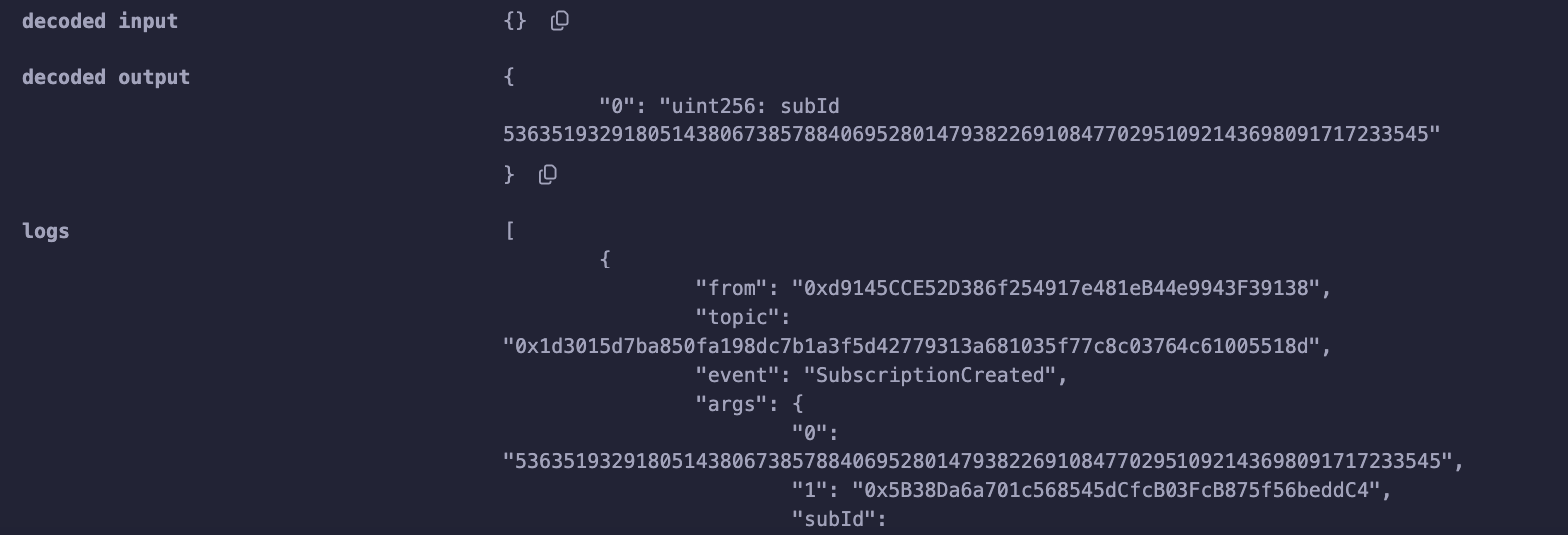 In the Remix IDE console, read your transaction decoded output to find the subscription ID. Note the subscription ID, which is required for multiple steps in this tutorial.