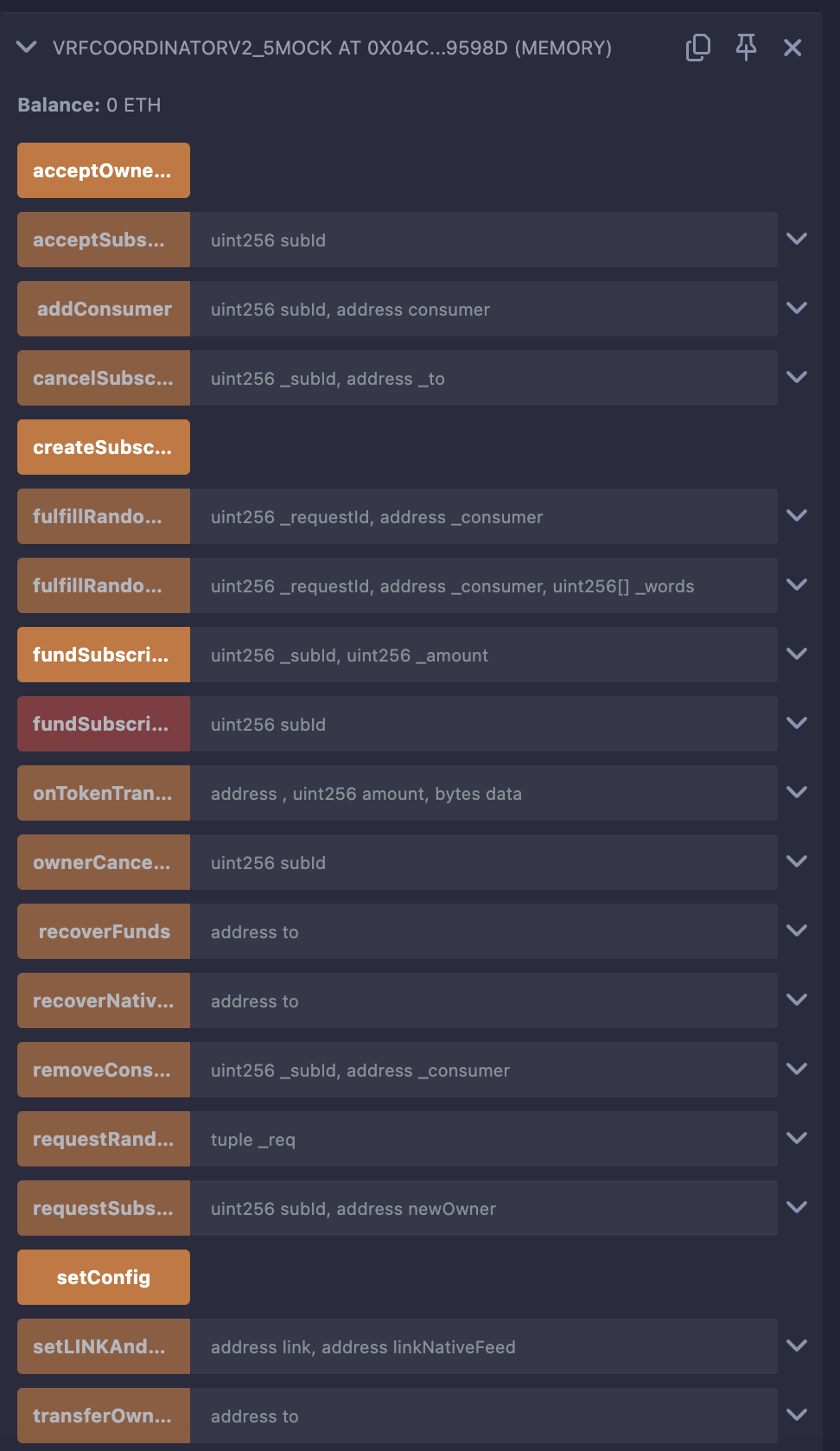 Under Deployed Contracts, open the functions list of your deployed VRFCoordinatorV2_5Mock contract.