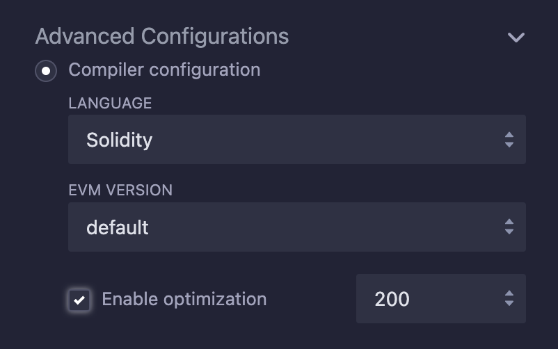 On the Solidity Compiler tab, expand the Advanced Configurations section and check the Enable optimization box before you compile the VRFCoordinatorV2_5Mock contract: