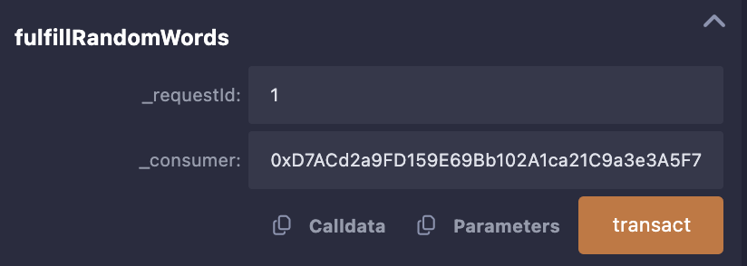 - Call the VRFCoordinatorV2_5Mock fulfillRandomWords function to fulfill your consumer contract request.